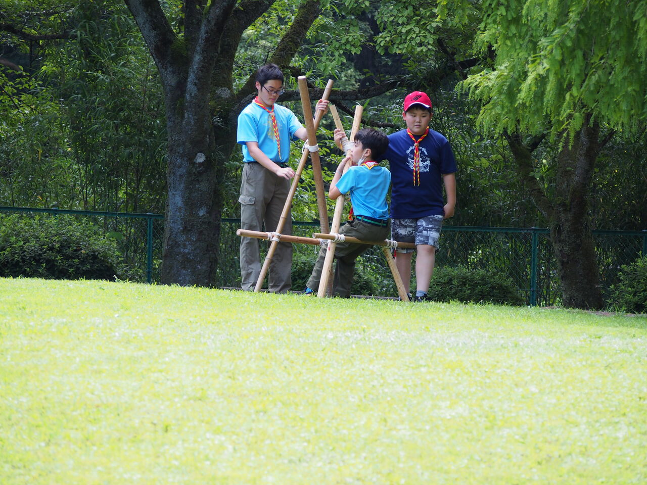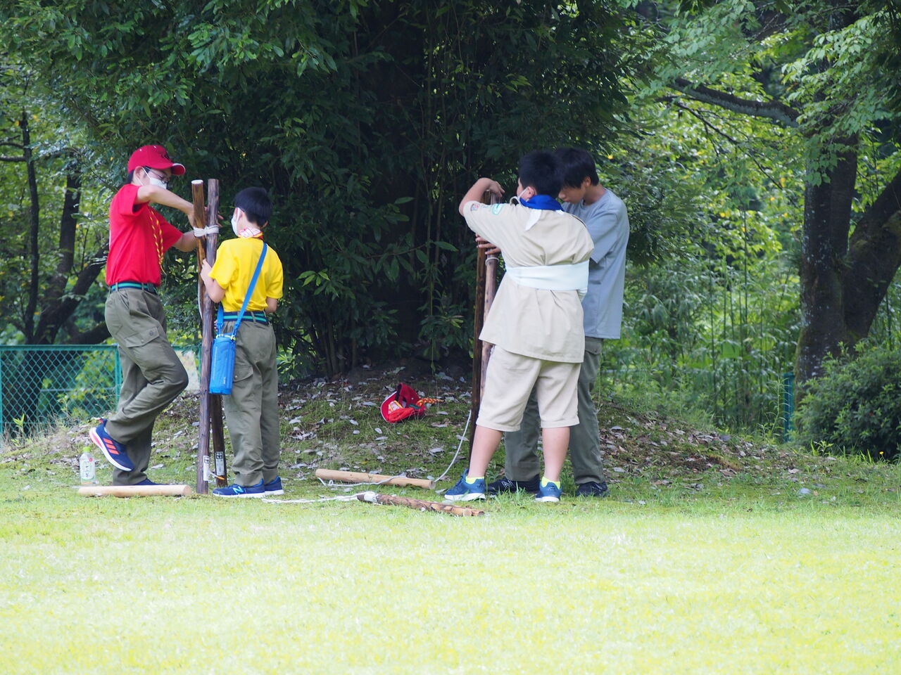 ボーイ隊は予定を変更して、まずはソロテントの建て方しまいかた。