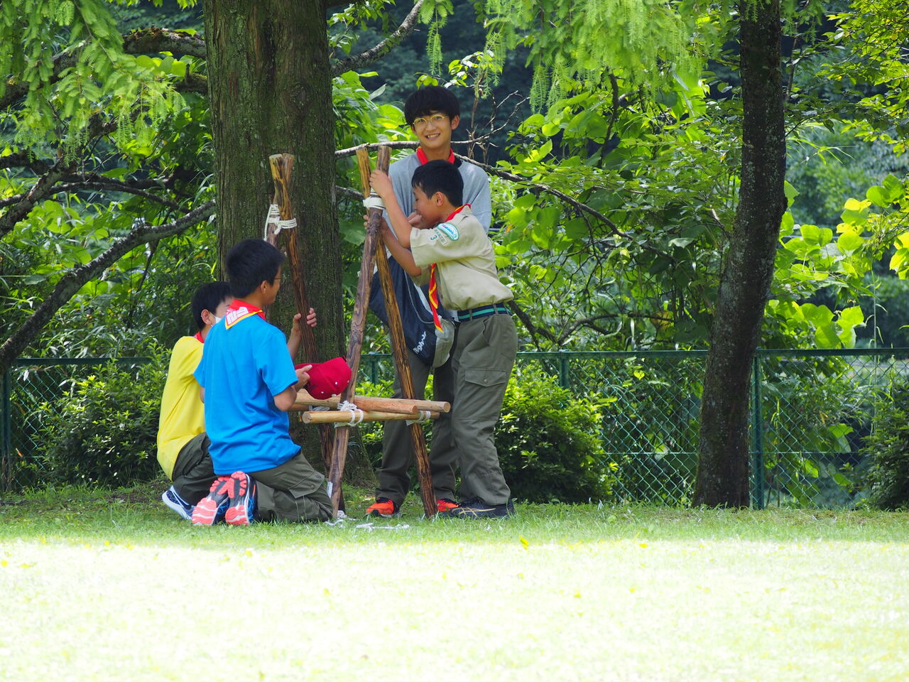 昨日建てて、今朝しまって、そのやり方を班員に教えながら。