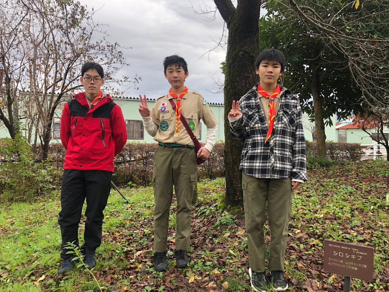 団の記念樹前で撮影